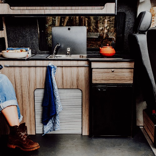 Twee pits kooktoestel op gas en een koelkast met vriesvak. En stromend water mag natuurlijk niet ontbreken.